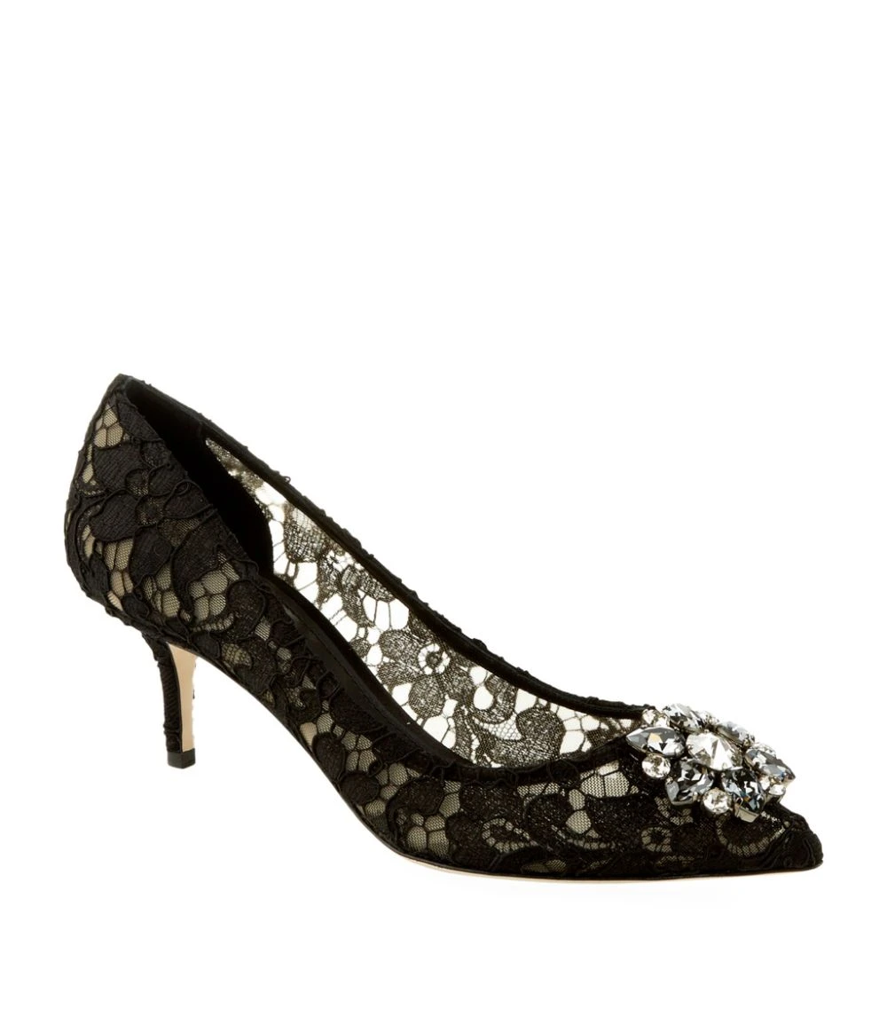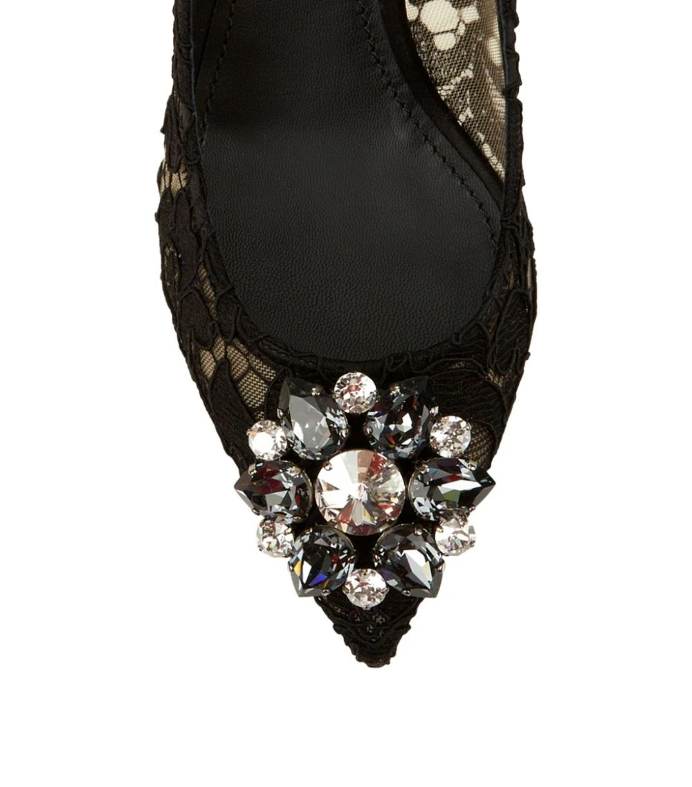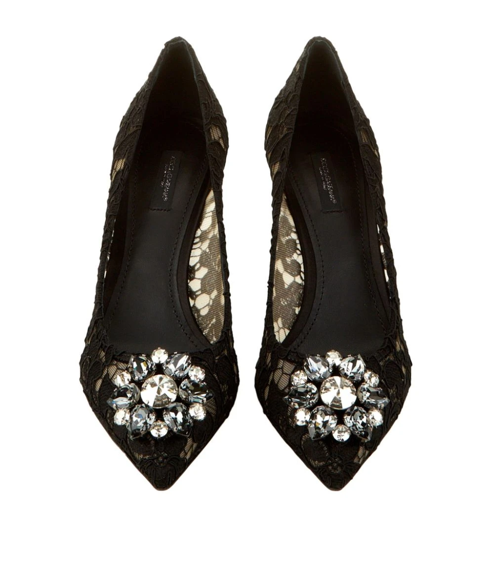 Add a sparkling touch of refinement to your shoe collection courtesy of Dolce & Gabbana’s Rosa pumps. Crafted in Italy from delicate floral lace, the low-heel shoe bears a sharply pointed toe adorned with an oversized crystal embellishment. Feminine and sophisticated, slip them on with a ladylike dress for elegant charm.