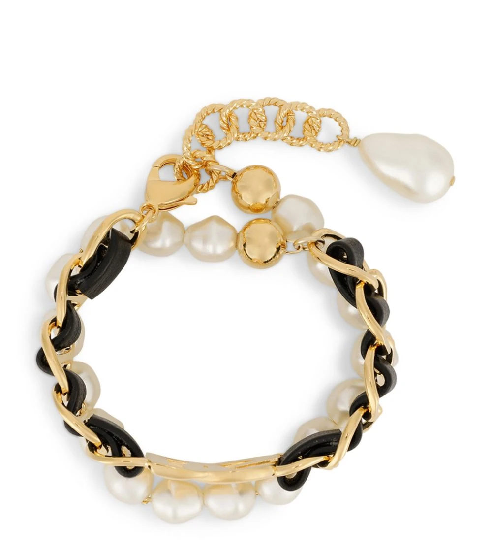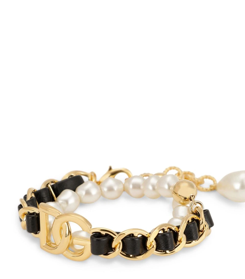 Artfully crafted with sleek black leather thatβs meticulously woven through the gold-tone chains, this Dolce & Gabbana bracelet exudes rock βnβ roll elegance. Afforded a further touch of contrast with pearlescent beading, this elegant accessory brings an effortlessly cool look to your wrist whether worn alone or stacked with other bracelets.