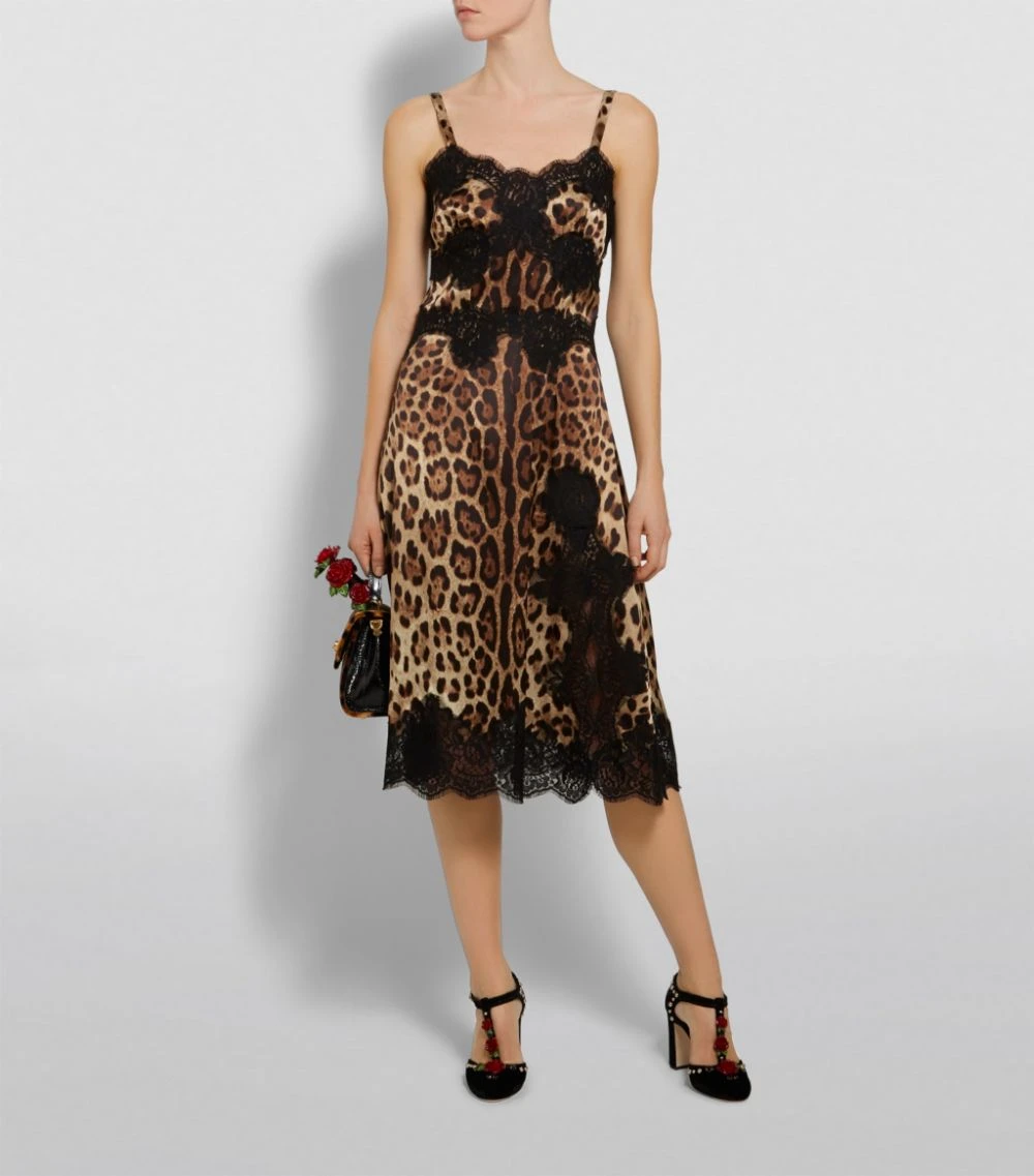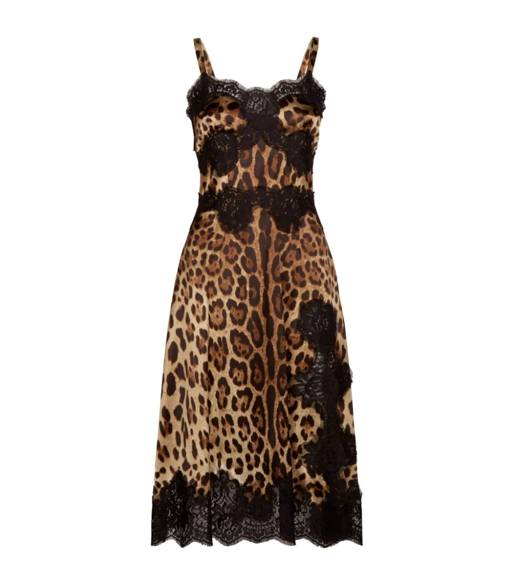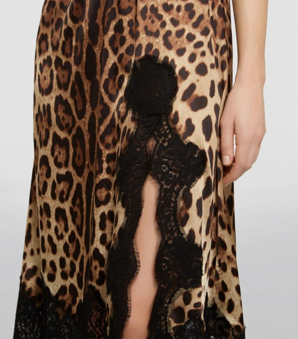 Mimicking sultry nightwear for evening elegance, this Dolce & Gabbana slip dress is imagined in the coveted leopard print of the moment. Trimmed with delicate lace with a side split, it makes the perfect after-dark piece for soirées and dinners.