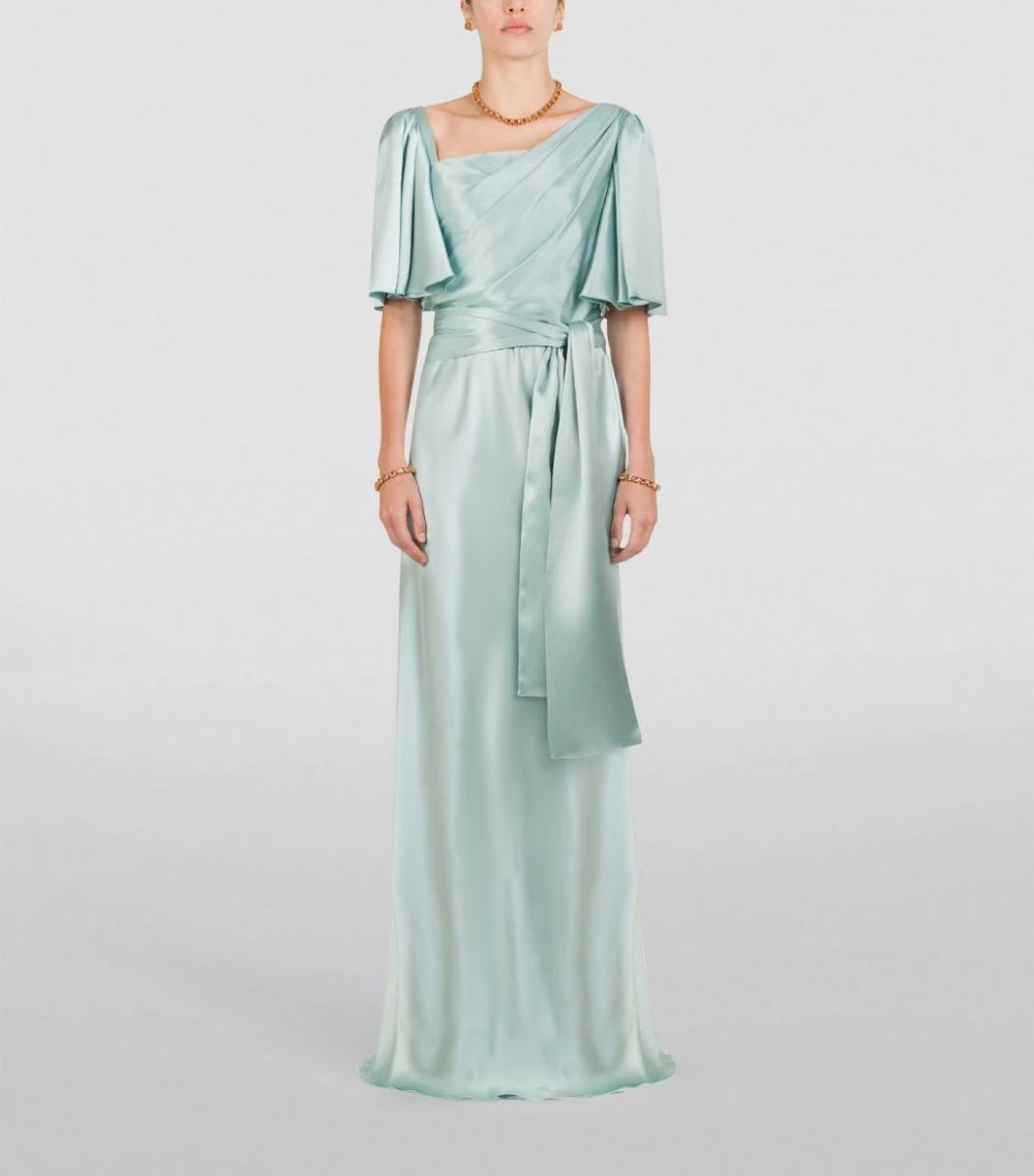 This Dolce & Gabbana dress offers a masterclass in draping. It’s easy to imagine the brand’s creative approach – you feel transported to the atelier, watching as swathes of fluid silk are wrapped delicately around a mannequin as part of the conceptual development of the silhouette. The finished piece refers back to that moment of inception as it appears effortlessly natural, highlighting its draped quality with gathered details and a wrap style that culminates in a belted waist.