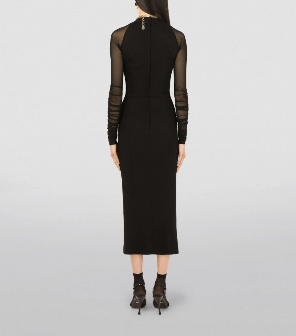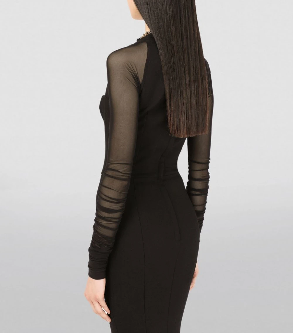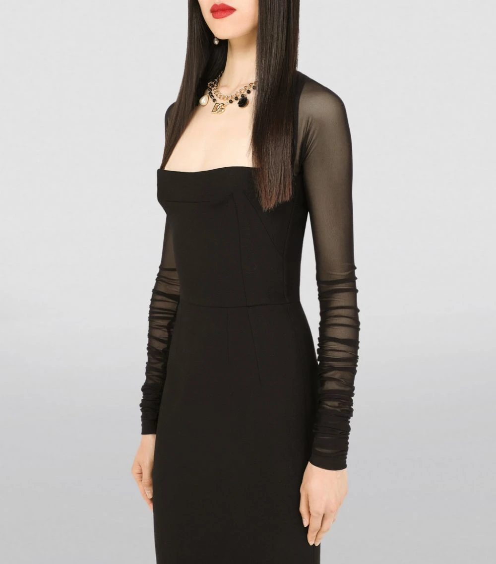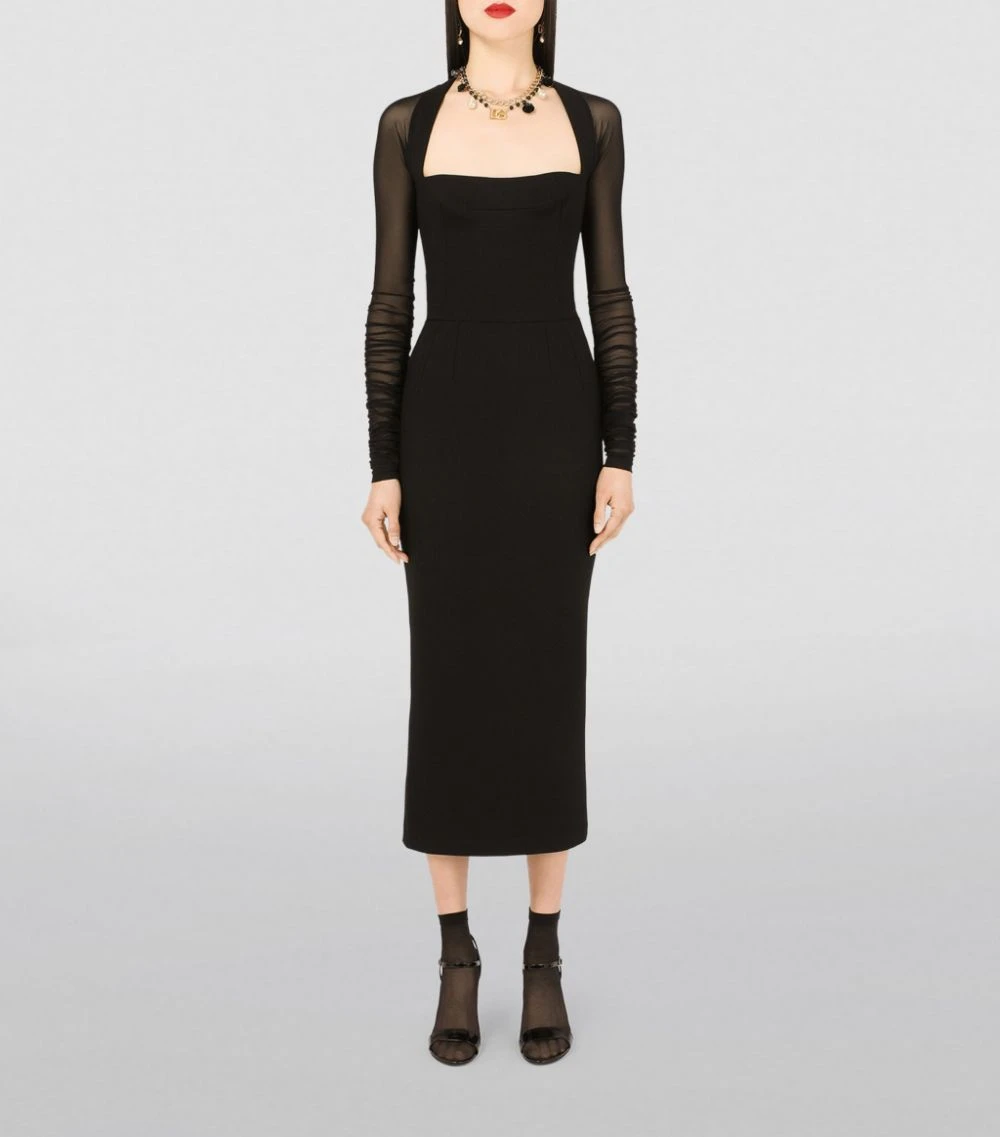 Dolce & Gabbana’s Autumn/Winter 2021 collection is filled with pieces like this midi dress – designed to see you through party season and beyond with their timeless designs and subtle, feminine details. Alluring semi-sheer tulle sleeves are an immediate focal point, infusing this piece with a healthy dose of modern sensuality, while a delicate square neckline allows for an enticing glimpse of décolletage.